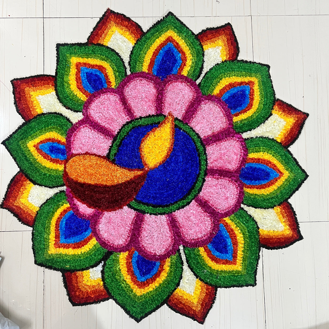 Bring home tradition without the mess! Our Round Fur Rangoli Mats are soft, vibrant, and ready-to-use – no powders needed.